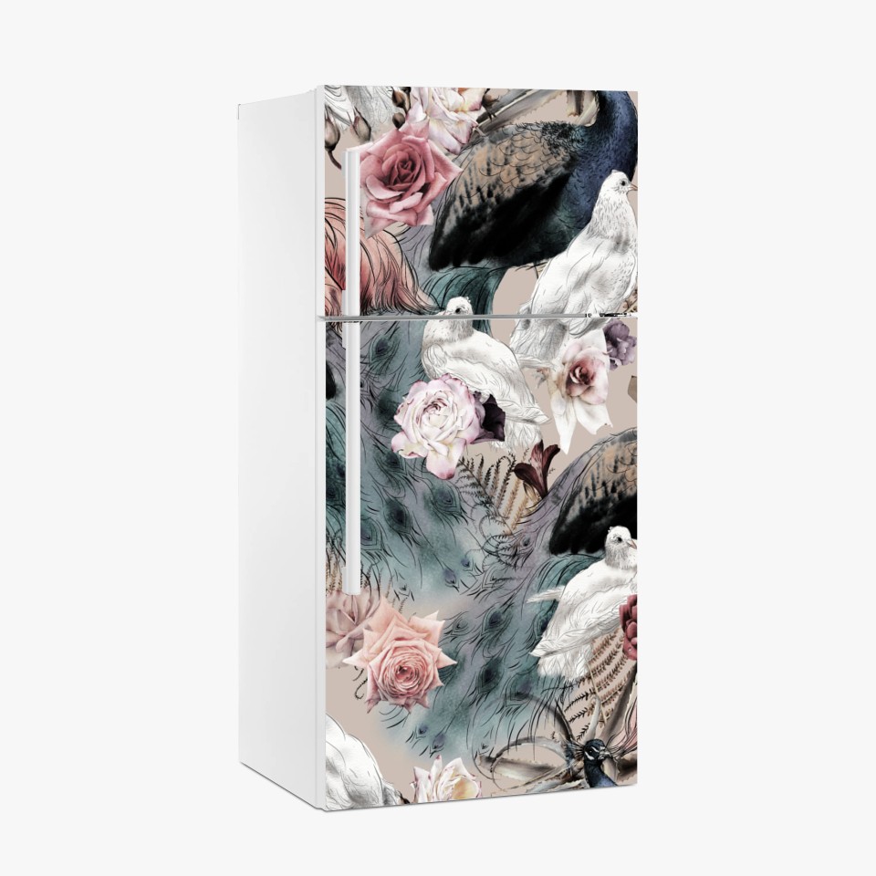 Kühlschrankaufkleber Aquarellmuster mit vögeln und rosen