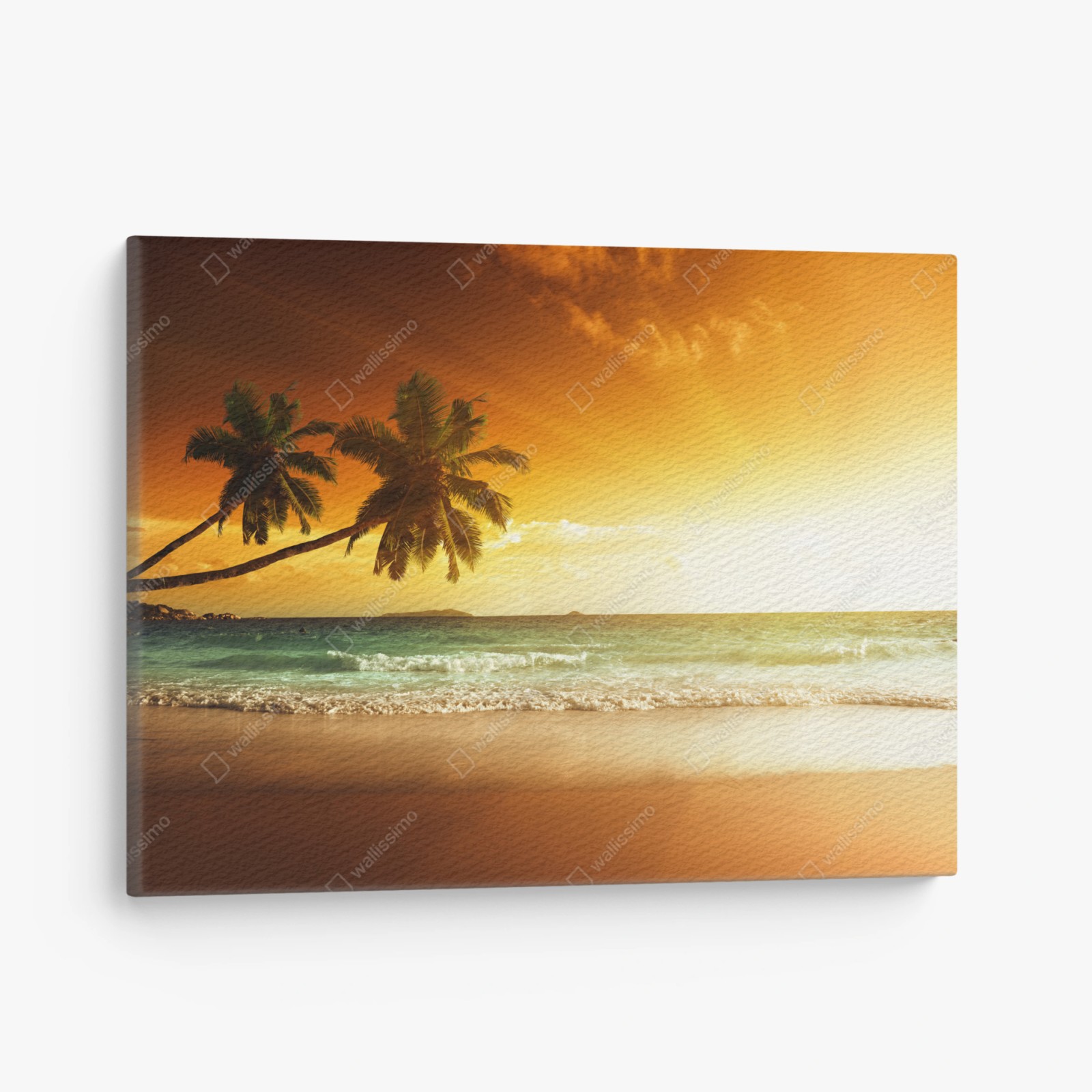 - meer, sonnenuntergang, küste, strand, tropisch, paradies, meerlandschaft, wellen, palmen, goldenestunde
