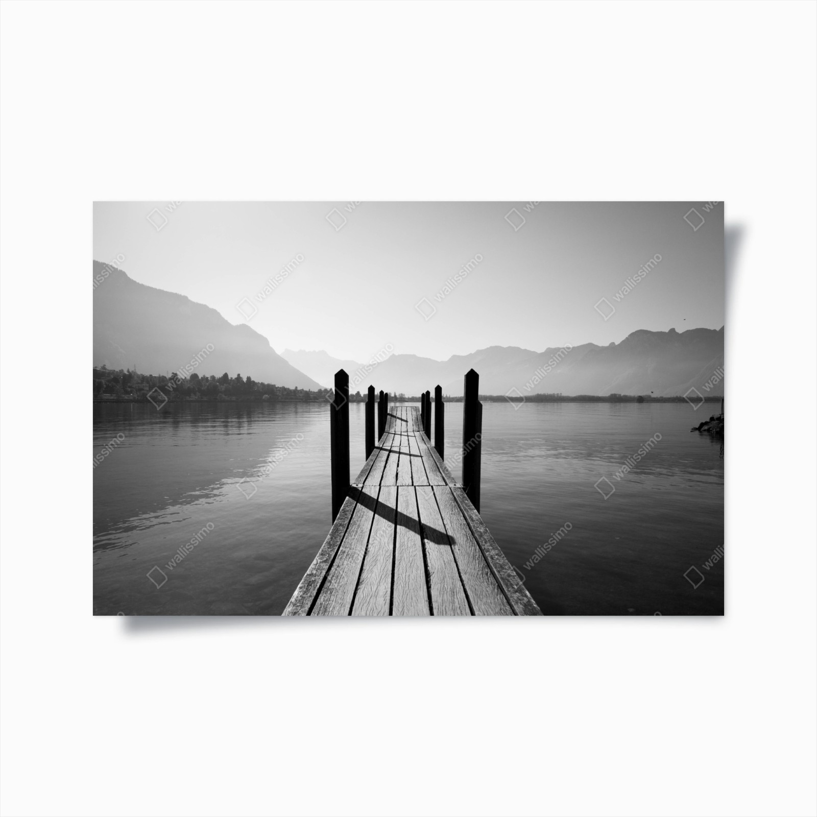- minimalistisch, natur, horizont, landschaft, see, berge, ruhe, schwarzweiß, steg, reflexion