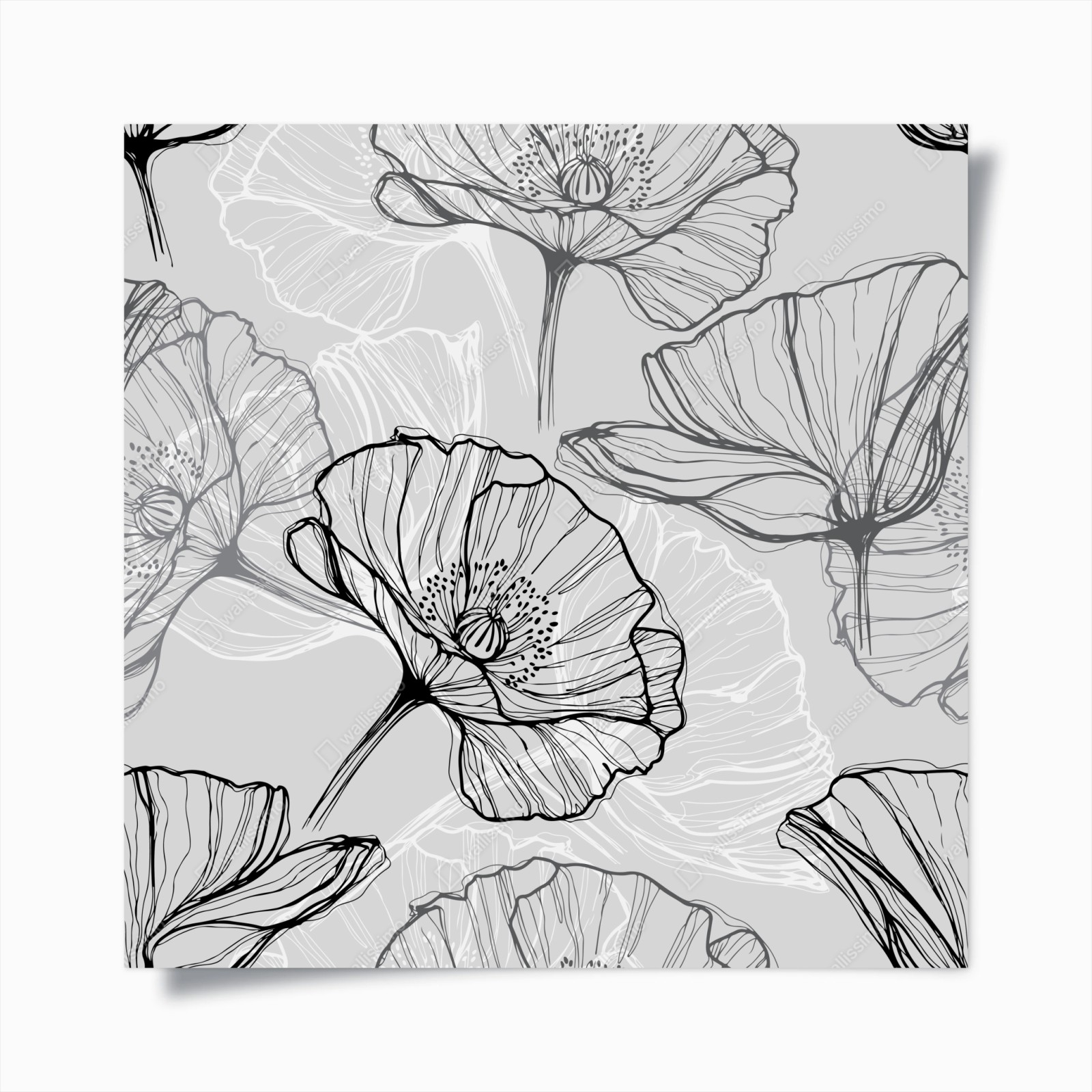 - botanisch, blumen, nahtloses muster, tapete, monochrom, wandkunst, linienzeichnung, blume, mohn, graustufen