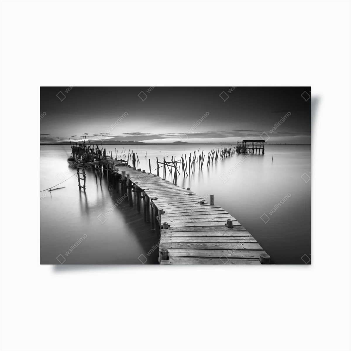- minimalistisch, meer, landschaft, ruhig, wasser, monochrom, schwarzweiß, pier, holzsteg, langzeitbelichtung