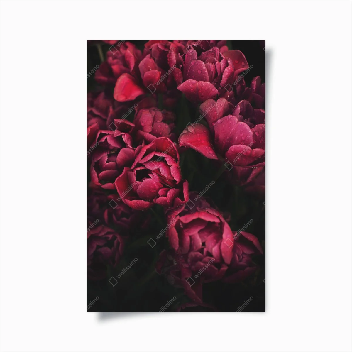 - nahaufnahme, botanische kunst, romantisch, makrofotografie, dunkle blumen, rote blüten, tautropfen, stimmungsvolle blumen, naturdekoration, blütenstruktur