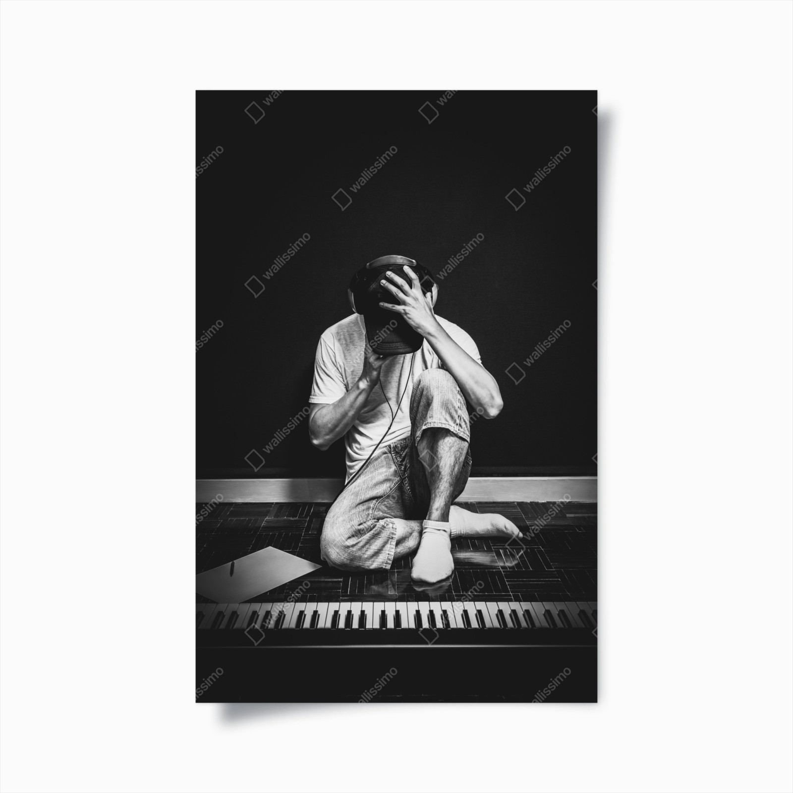 - stimmungsvoll, schwarzweiß, sitzend, studio, kopfhörer, pianist, keyboard, musiker, introspektiv, songwriting