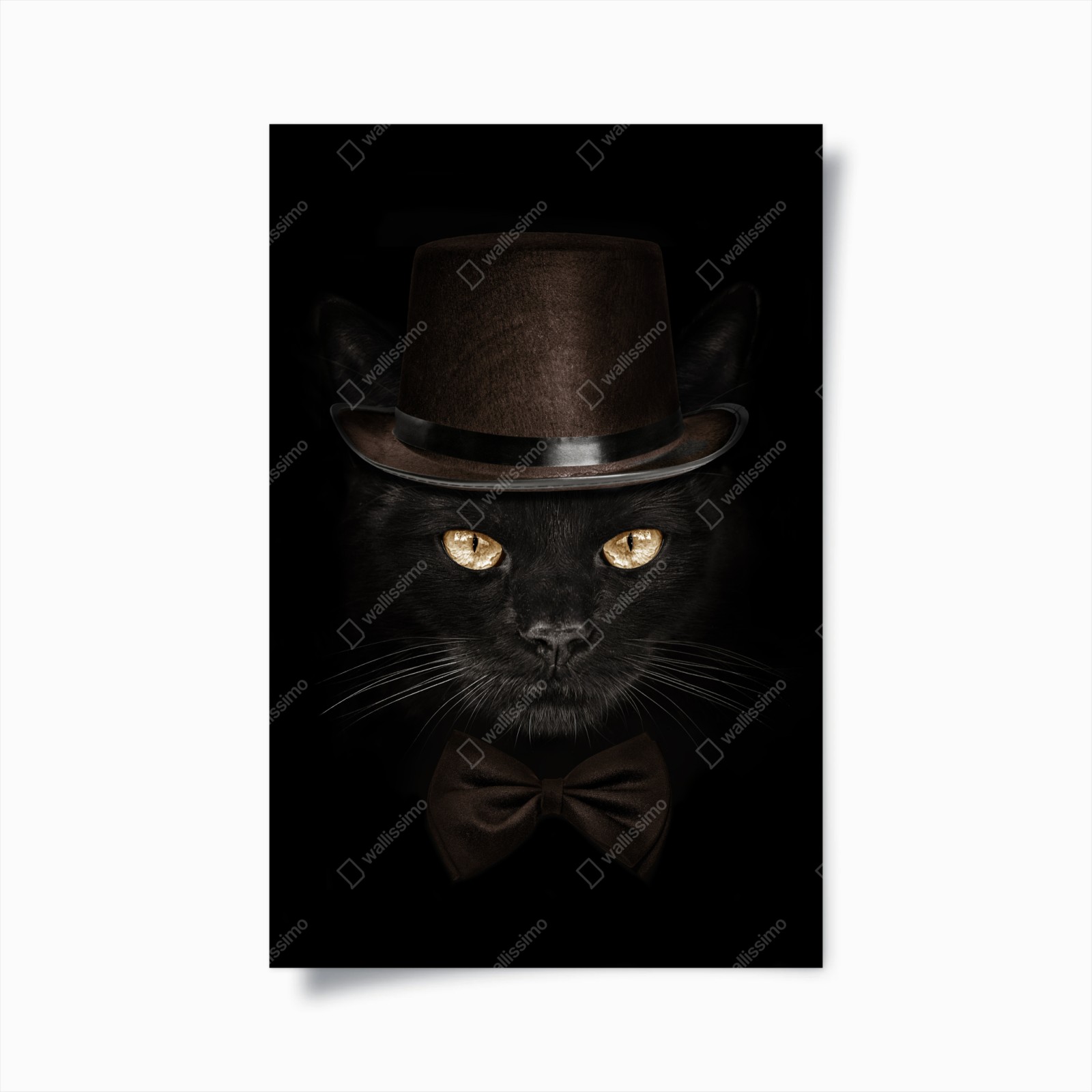 - wandkunst, verspielt, klassisch, dunkler hintergrund, haustier, schwarze katze, katzeporträt, zylinder, fliege, goldene augen
