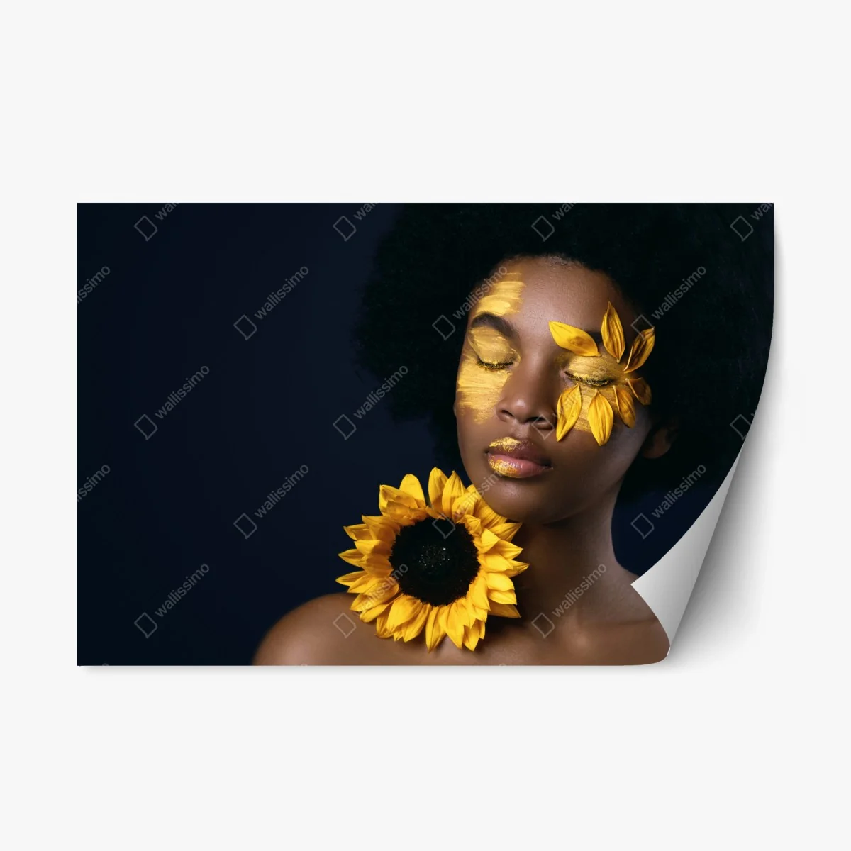 - botanisch, gelb, porträt, sonnenblume, afrikanische frau, schönheit, natürlich, künstlerisch, gesichtsmakeup, afro