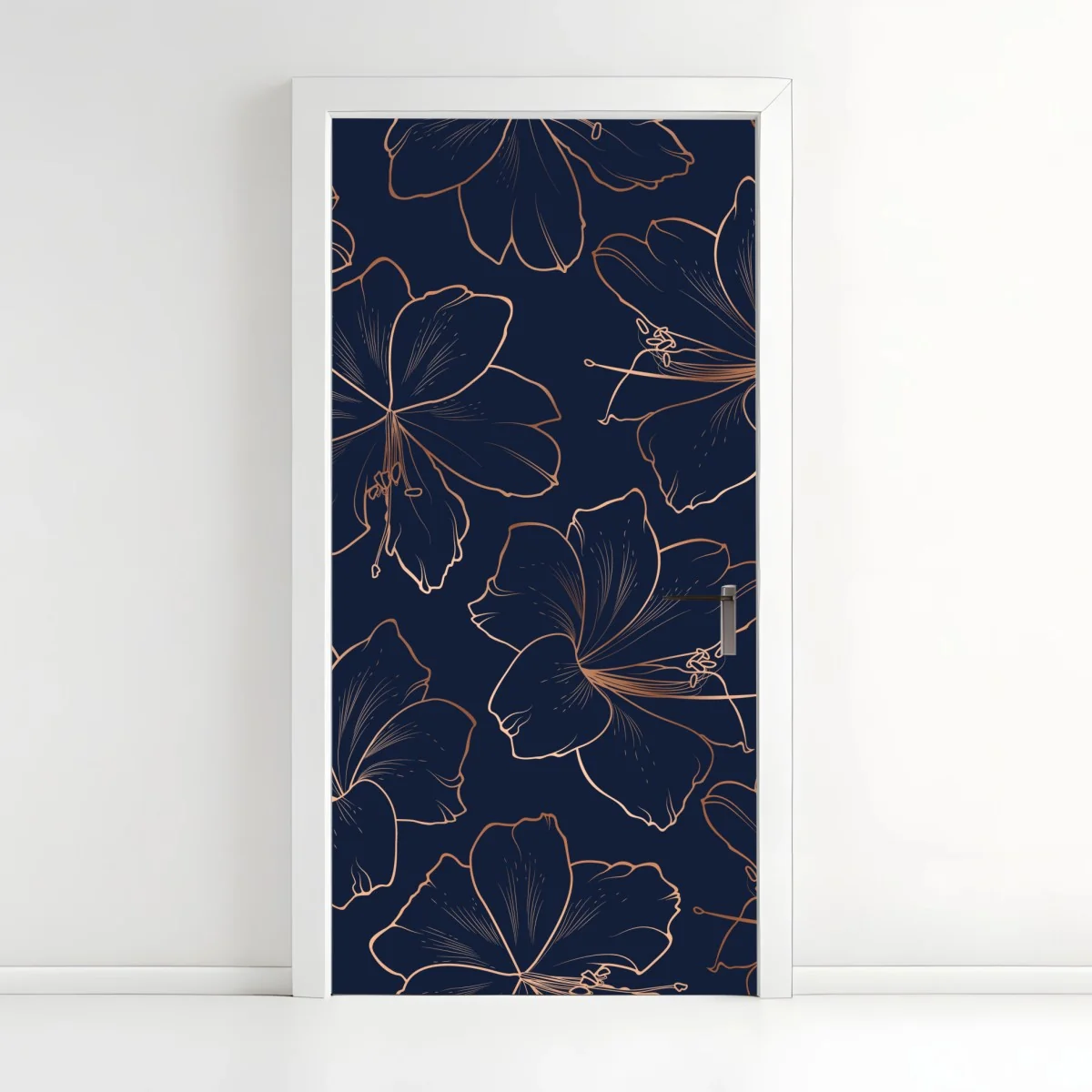 Türaufkleber Dunkelblaues muster mit goldenen blumenkonturen